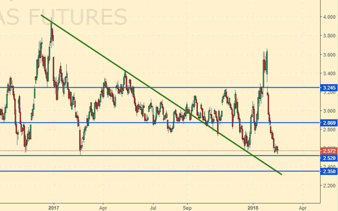 Сценарий роста: рассматриваем мартовский фьючерс с датой экспирации 26 февраля. Тут уже кое-какие газовые компании в Канаде вместо добычи газа переключаются на добычу Биткоина. И это не шутка. А что делать с таким рынком? Кому денег не жалко, могут здесь купить. Стоп: 2.48. А может и стрельнет.