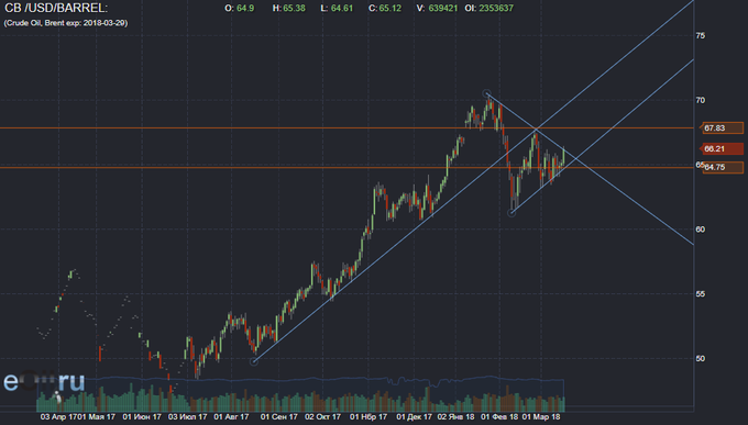 Сценарий роста: рассматриваем майский фьючерс, дата экспирации 29 марта. Вот цитата из прошлого отчета: «Если мы прорвемся выше 66.20, это будет очень сурово». И вот оно, равновесие перед закрытием недели — 66.21. Надо ли тут покупать? Пока нет, ждите роста выше 66.50.
