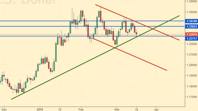 Сценарий роста: рынок ждет результатов заседания ФРС 21-го марта. Никаких резких движений заранее не последовало. Может быть увидим в понедельник небольшое укрепление доллара, если пробьемся ниже 1.2270. В целом, пока мы ниже 1.24000 покупать не хочется. Кто вошел в лонг, поставьте стоп на 1.2258.