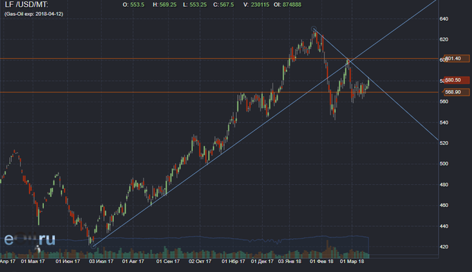 Сценарий роста: рассматриваем апрельский фьючерс, дата экспирации 12 апреля. Подъем выше 600.00 выглядит пока маловероятным. Но и текущий уровень — 580.00, вполне может стать хорошим сопротивлением. Пока не покупаем, хотя желающие могут попробовать на «часовках» отработать ход: 582.00 – 598.00.