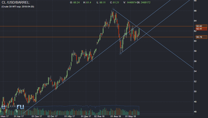 Сценарий роста: рассматриваем майский фьючерс, дата экспирации 20 апреля. Снова зеленая свеча, как и в прошлую пятницу. Сказать, что этот рывок как-то вдохновит покупателей мы не можем. Его просто недостаточно. Надо уходить выше 63.00.