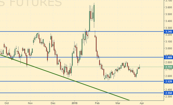 Сценарий роста: рассматриваем майский фьючерс с датой экспирации 27 апреля. Если это формирование импульса вверх, то оно очень слабое. Покупаем только после роста выше 2.86 на малых интервалах.