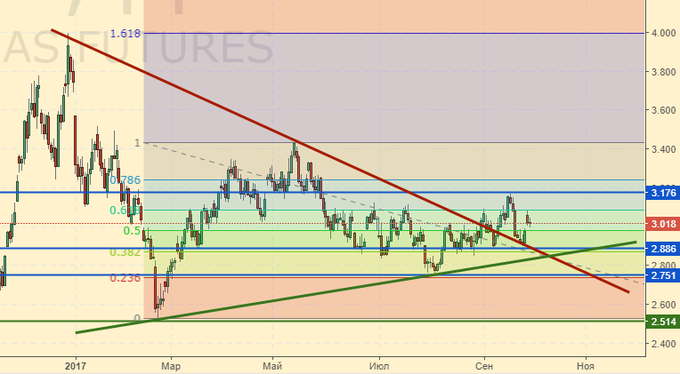 Сценарий роста: наша уверенность в росте цен пока оправдывается. Напомню, мы призывали покупать или добавлять к позициям на падении. Стоп: 2.74. Цены снова выше 3.00 и есть шансы на продолжение роста.