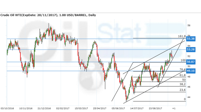 Сценарий роста: рассматриваем декабрьский фьючерс с датой экспирации 31 октября. Вопрос вопросов в данной ситуации: будет ли еще один ход на верх с установкой нового максимума или мы уже отправляемся на 53.84. Ответ: все ходы не заберешь. Разумно подождать спуска цен к 53.90 и только там покупать.