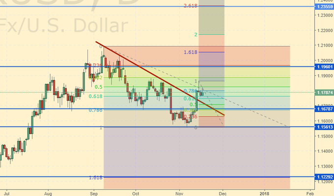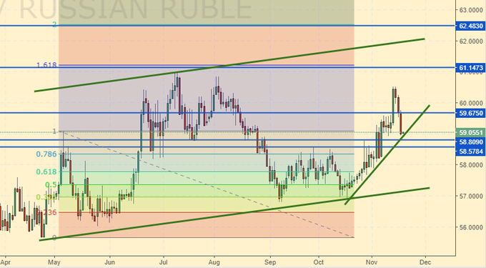 Рубль не стал стоять над 60.00 и опустился под данный психологически важный уровень. Пока нефть и ОФЗ поддерживают российскую валюту. Если потрясений не случится, то возможно укрепление рубля до 55.00. В середине декабря станет ясно будет ли президент выдвигать свою кандидатуру на новый срок. То, или иное решение, может повлиять на ситуацию с валютой. Неопределенность, связанная с программами развития, способными структурно усилить экономику и общество, довлеет над умами стратегов (долгосрочных игроков). Признаюсь, что уход ряда первых лиц и топ-менеджеров от реальности в блокчейн, биткоин и иное, не производит впечатление. Но у нас всегда есть возможность разрешить казино по всей стране.