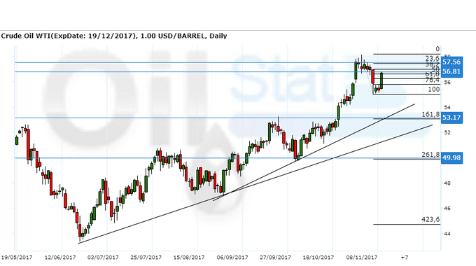 Сценарий роста: рассматриваем январский фьючерс, дата экспирации 19 декабря. Уровень 56.81 является важным уровнем сопротивления. Если рынок пройдет выше, то дальше медведи будут встречать на 57.56, если и этот уровень не устоит, тогда мы уйдем в район 60.00. Однако, наиболее интересен сценарий, когда цены откатят к 53.20 или 50.00, так как покупка из глубины всегда более предпочтительна.