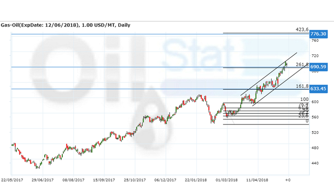 Сценарий роста: рассматриваем июньский фьючерс, дата экспирации 12 июня. Те, кто не стал закрывать позиции, на прошлой неделе с надеждой смотрят на 770.00. Рост к данным значениям возможен на фоне летнего сезона и роста потребления автомобильного топлива. Лонги можно открывать здесь только на малых интервалах. На дневных возможна дерзкая покупка со стоп-ордером на 689.00.
