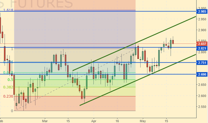 Сценарий роста: рассматриваем июньский фьючерс с датой экспирации 29 мая. Можно констатировать, что покупкой от 2.70 удалось хорошо войти в рынок.  Теперь надо набраться терпения и ждать.