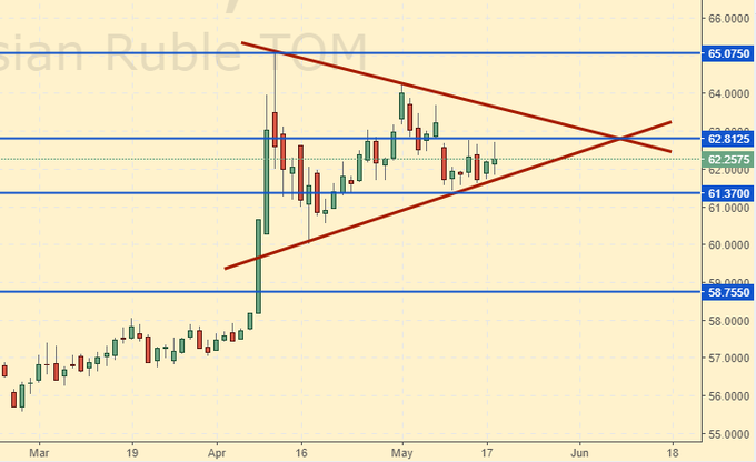 Сценарий падения: с Америкой у нас торговля мизерная, могут там что угодно творить, особенно после того, как Европа показала зубы. Папу перестали слушаться. Причем все.  Даже Лондон против расторжения сделки с Ираном вместе с Берлином и Парижем. Что случилось? Неужели положение дел таково, что вместе с очередным кризисом США сольют? Иначе бы чего это Елизавета стала так себя вести. Брак внука с гражданкой США был видимо последней уступкой королевского двора. В обычной ситуации, мы должны сходить на 59.00 – 60.00. Не исключено, что рубль будет укрепляться прямо в понедельник. Меркель нам в помощь.
