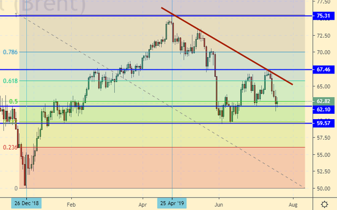 Сценарий роста: рассматриваем сентябрьский фьючерс, дата экспирации 31 июля. С точки зрения волновой структуры мы пали слишком низко. Проход ниже 62.00 выглядит чрезмерным. Покупать здесь тяжело. Лучше ждать роста выше 66.00, как минимум.