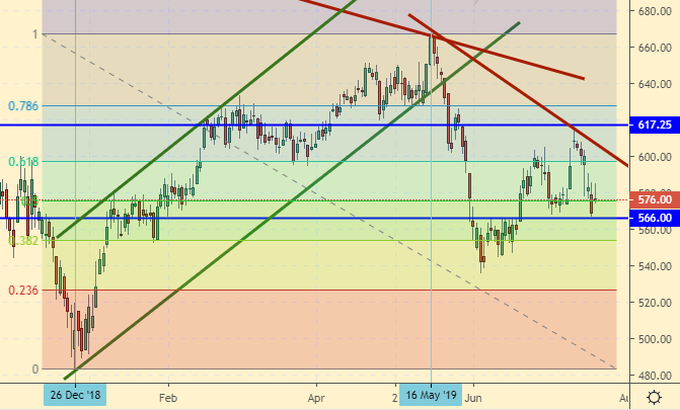 Сценарий роста: рассматриваем августовский фьючерс, дата экспирации 12 августа. Все наступление рассыпалось. Возможно, что мы видим коррекцию, но она настолько однонаправленна, что представлять себе бычий ренессанс здесь не хочется. Для покупок ждем роста выше 610.0.