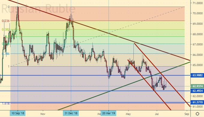 Сценарий роста: ждем заседания ЦБ РФ в пятницу. Могут снизить ставку на 0,25%. На рбуль это не должно сильно повлиять, так как этого ждут, да и инфляция сейчас ниже 5% годовых. Вероятность снижения ставки ФРС США на 0,25% 31-го июля оценивается рынком как стопроцентная. Эти ожидания не помогают доллару расти. Яркая иллюстрация этого длинные тени вверх по данной паре на прошлой неделе. Попытка пробиться выше 64.00 ни к чему не привела. Пока от покупок доллара воздерживаемся.