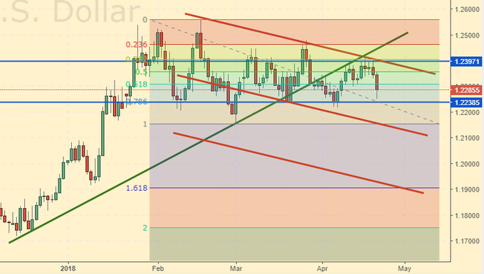 Сценарий роста: шансов мало, но с точки зрения техники надо поупрямиться. Если выбило по стоп-ордеру, то надо купить снова с новым стопом на 1.2245. Следует признать, что неделя закончилась для евро неудачно и картинка уже медвежья. У быков остались очень маленькие шансы на рост. 26 апреля посмотрим, что скажет ЕЦБ по ставке. И какие будут сделаны заявления. Если риторика будет мягкой, то мы быстро отправимся на 1.1900.