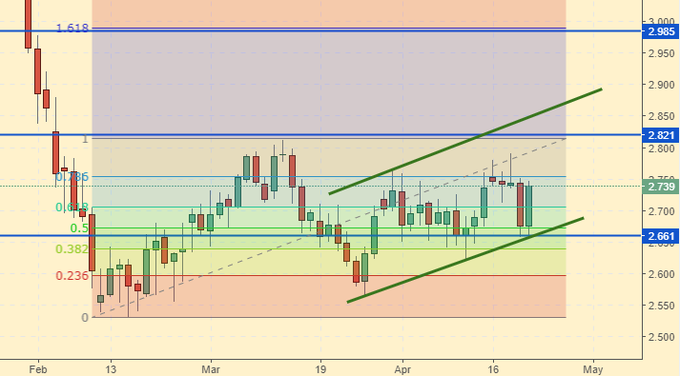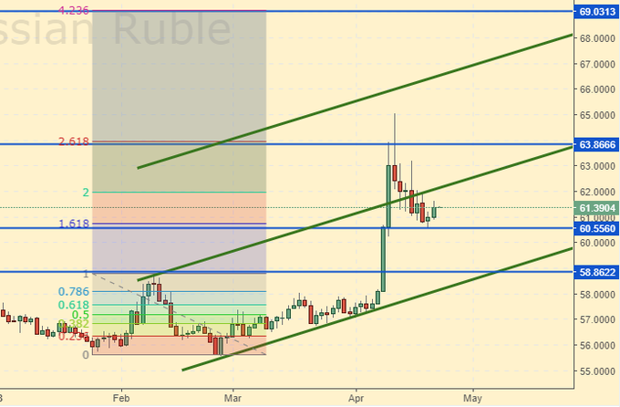 Пока США новых санкций не вводят, а нефть растет в цене, благодаря чему рубль чувствует себя вполне комфортно. 27 апреля в 13.30 по Москве почитаем пресс-релиз Банка России после заседания Совета директоров. После неприятного рывка рубля на фоне санкций и роста инфляции из-за цен на овощи, вряд ли мы увидим намеки на возможность снижения ставки в ближайшее время, на что очень рассчитывало правительство, так как строительный сектор продолжает у нас задыхаться, а ипотека по более привлекательным условиям была бы очень кстати для экономики в целом.