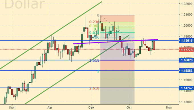 Сценарий роста: наше немного маниакальное желание не покупать полностью оправдало себя в пятницу. Если раньше были сомнения в том, что рынок не пойдет выше 1.1860, то после «медвежьего поглощения», правда не на вершине тренда, а на менее значимом участке, эти сомнения нельзя сказать, что улетучились, но уменьшились в разы. Не покупаем.