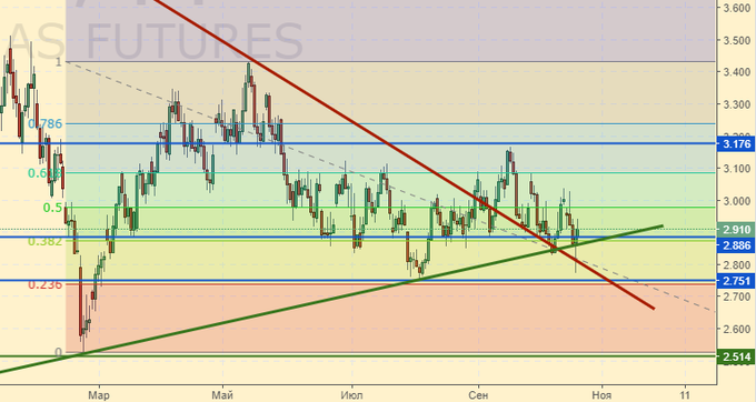 Сценарий роста: рассматриваем декабрьский фьючерс с датой экспирации 20 ноября. Не смотря на скорый подбор, падающих цен в пятницу, следует отметить, что быки начинают слабеть. Если хода выше 52.70 не последует, мы отправимся в район 46.00.