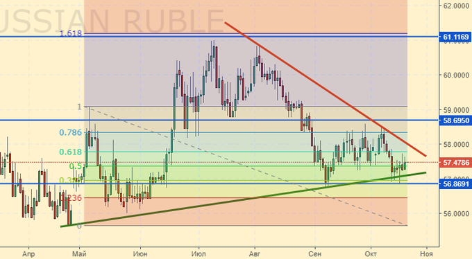 Сценарий роста: рассматриваем декабрьский фьючерс с датой экспирации 31 октября. Полуконспиративные движения с непонятным исходом накрыли поле битвы. Цена мечется из угла в угол, оставляя надежду как быкам, так и медведям. Если вы зашли в позицию и остались в ней после роста выше 57.70, держите (передвиньте) стоп на 56.40. Учитывая сильный пролив цен в пятницу, должны сказать, что позиция быков ослабла.