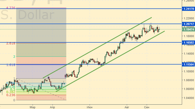 Сценарий роста: какая красота, в виде почти созревшей головы с плечами. На фоне выборов в Бундестаг, которые проходят сегодня в воскресенье 24 сентября, евро может и сдать позиции. Верхняя тень пятницы подтверждает опасения толпы. С покупками не торопимся. Если канал вниз будет пробит, то и до 1.1200 можем долететь. И быстро.