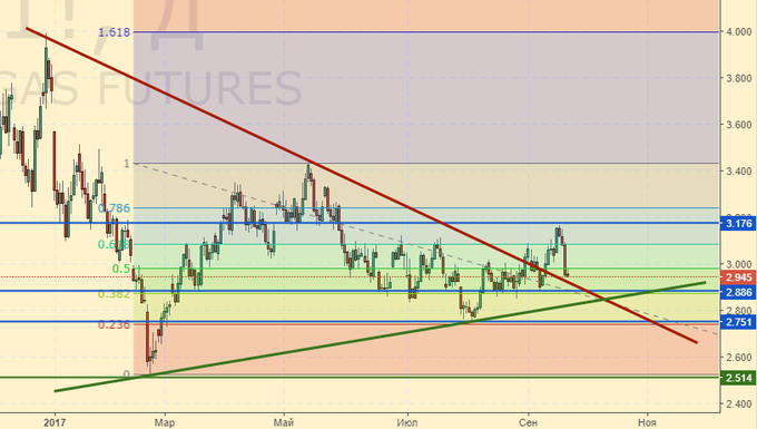 Сценарий роста: рассматриваем ноябрьский фьючерс с датой экспирации 27 октября. Помните? «Снова дождь рисует мне, на заплаканном окне, твой печальный силуэт…» тра-ля-ля. Но тут стоит обратить внимание на пробой линии сопротивления и импульс вверх с марта по июнь, чье влияние пока не исчерпано. А вот покупаем, добавляем и усиливаем прямо здесь. Кто в позиции, добавить.
