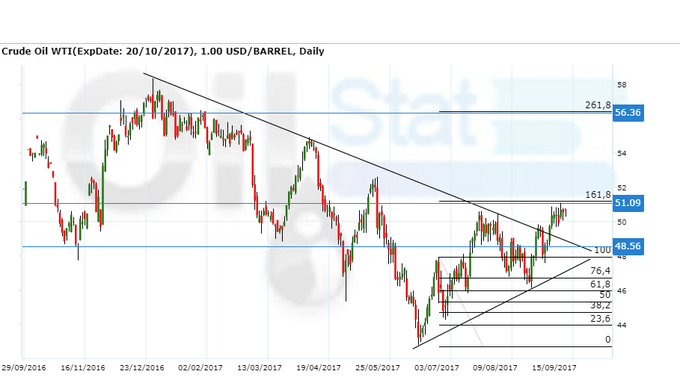 Сценарий роста: рассматриваем ноябрьский фьючерс с датой экспирации 20 октября. В отличии от Brent американский эталонный сорт не торопится расти. По технике возможен откат к 48.60, где можно купить. Стоит отметить, что мы вторую неделю закрываемся выше 50.00, что вовлекает в рынок все большее число спекулянтов на локальных максимумах. Неплохо бы их немножко наказать и скорректироваться.