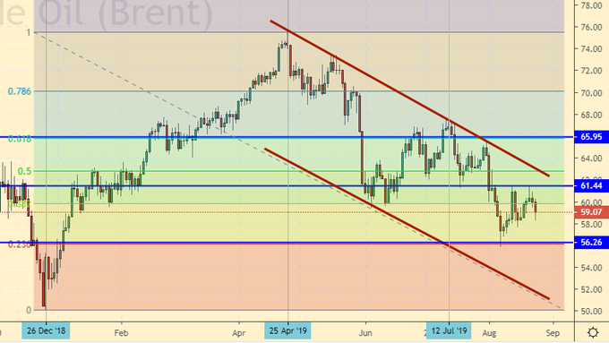 Сценарий роста: рассматриваем октябрьский фьючерс, дата экспирации 30 августа. Быкам не удалось пройти выше 61.60 и создать угрозу прохода к 64.00. В складывающихся обстоятельствах ждем продолжения падения. Не покупаем.