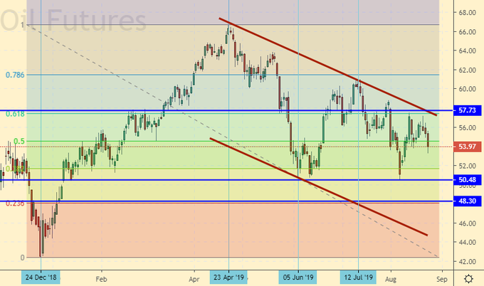 Сценарий падения: продолжаем стоять вниз. Так бы и стояли, и стояли, честное слово. Рынок может провалиться к 40.00 в случае продолжения торговых войн. Но цена 40.00 никак не сможет устроить ОАЭ, для них это крах в течение двух лет, там в бюджете 70.00. Поэтому, ждем инициатив от ОПЕК+.