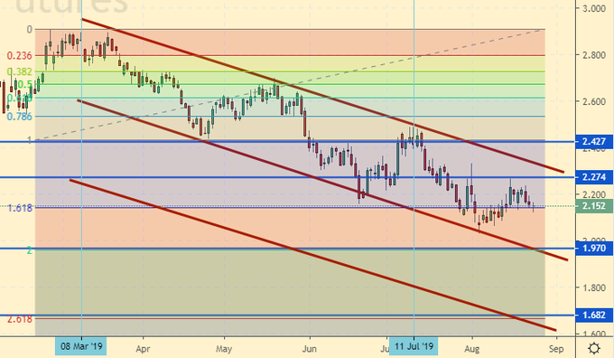 Сценарий роста: рассматриваем сентябрьский фьючерс с датой экспирации 29 августа. Быки не могут ничего сделать. Мы не смогли пройти выше 2.30, что предполагает продолжение движения в канале, а он у нас смотрит вниз. Покупать будем только после роста выше 2.40.