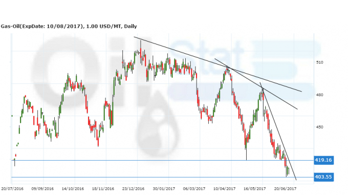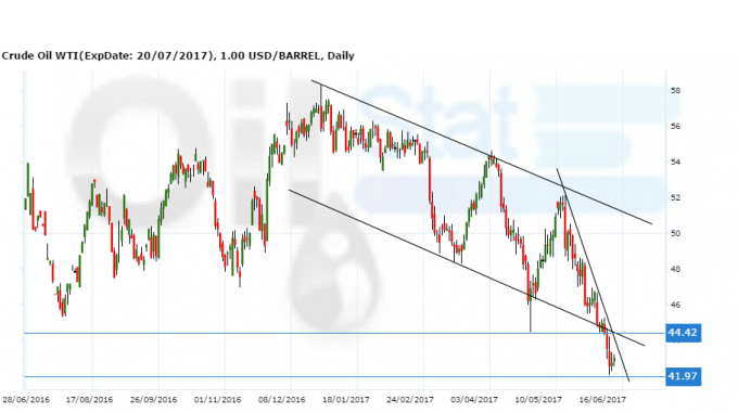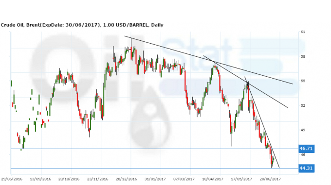 Сценарий роста: рассматриваем августовский фьючерс с датой экспирации 30 июня. Видим, что цена не перестает падать. Уровень 44.30 выступил краткосрочной поддержкой. Коррекция назрела, однако мы не видим сигналов разворота, так как не появилось ни одной зеленой свечи с длинным телом. Для размышлений о покупках рынок должен вырасти выше 46.00. В текущей ситуации не покупаем.