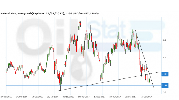 Сценарий роста: рассматриваем августовский фьючерс с датой экспирации 27 июля. Слишком размашисто. Нас продолжает выбивать из покупок. Теперь будем ждать роста цен выше 3.05 для того чтобы вернуться с идеями роста. Видим, что рынок проломил не слишком значимую поддержку и закрепился ниже 3.00. Покупать в такой ситуации не будем.