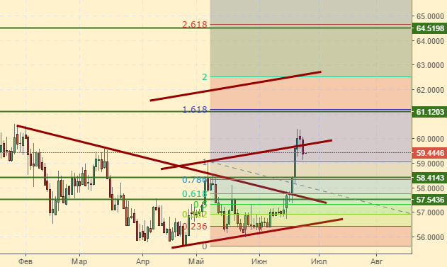 Сценарий роста: уровни 59.00 и 58.40 становятся в текущей ситуации промежуточными поддержками, а уровень 57.55 – основной. Если нефть не вырастет, возврата к 57.55 ждать не стоит. Если же цены достигнут 57.55, то от этого уровня можно купить.