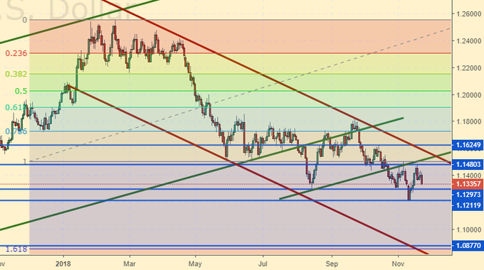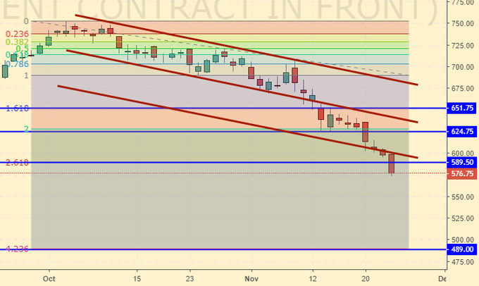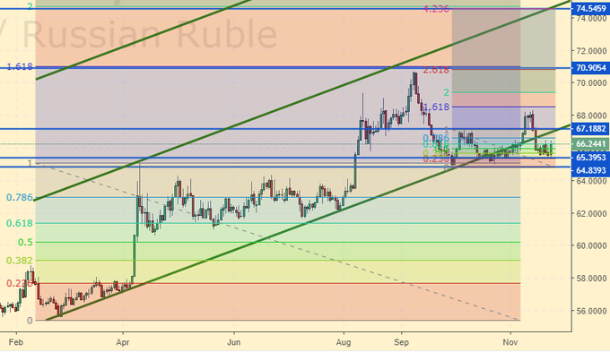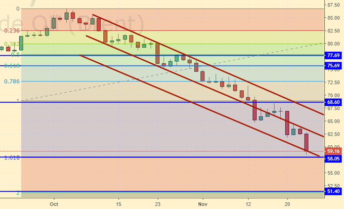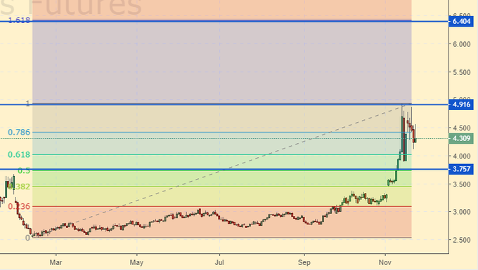 Сценарий роста: рассматриваем ноябрьский фьючерс с датой экспирации 29 ноября. Как видим, рынок не спешит разворачиваться вниз, что подтверждает серьезность произошедшего ранее вылета вверх. Действительно, американцы немного недобрали газа в хранилища и в случае сильной зимы будут не проблемы, а просто некоторое беспокойство, что таковые могут быть. Стоим в лонгах.