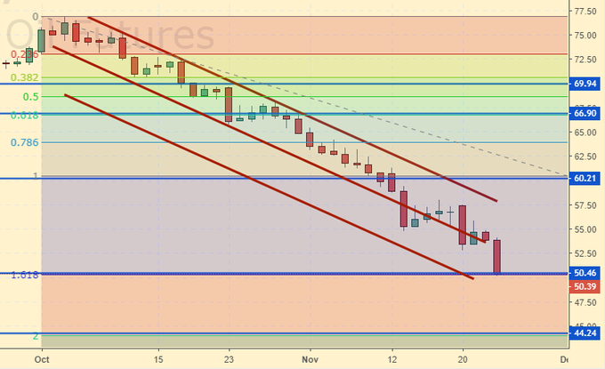 Сценарий падения: всех с профитом. Ждем отскок к 58.00 и продаем снова. Движение на 44.00 с текущих уровней уместным не выглядит.