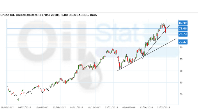 Сценарий роста: рассматриваем июльский фьючерс, дата экспирации 31 мая. Судя по открытому интересу, рост к 80.00 обеспечивали именно мелкие спекулянты, так как крупные уже несколько недель последовательно переходили из покупок в продажи. И вот в пятницу нефть упала на два доллара. Если 76.00 по Brent не устоит, то мы пойдем на 72.00. И вот там, и будет решаться вопрос о том закончился ли весь долгосрочный рост или нет.