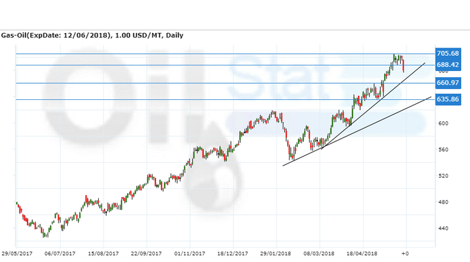 Сценарий роста: рассматриваем июньский фьючерс, дата экспирации 12 июня. Рынок топлива последовал за падением нефтяных котировок. Не исключено, что мы посетим район 630.00 – 635.00, где будет борьба за будущее. Учитывая весьма долгую историю роста, быкам будет непросто удержать рынок выше 630.00, но, если им это удастся, нас может ждать новая ветка роста к совсем уж неприличным максимумам в районе 800.00.
