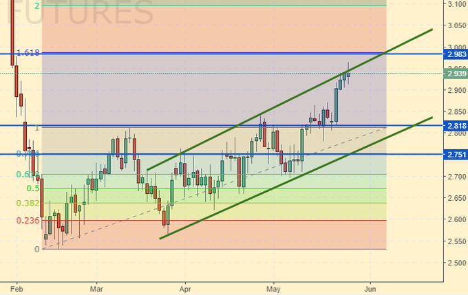 Сценарий роста: рассматриваем июньский фьючерс с датой экспирации 29 мая. Цены практически дошли до своего первого серьезного сопротивления на 2.98. Не исключено, что мы не сможем сразу преодолеть данный барьер и цены откатятся к 2.82. И именно данная отметка, в складывающихся обстоятельствах, будет наиболее комфортна для покупки.