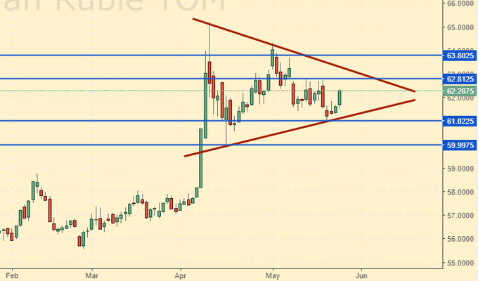 Сценарий роста: рубль в пятницу отправился вслед за нефтью. Рисуем сегодня чуть более широкую консолидацию, чем она была на прошлой неделе. Как видим, риски роста к 70.00 сохраняются. Подъем выше 63.00 откроет дорогу именно к 70.00.