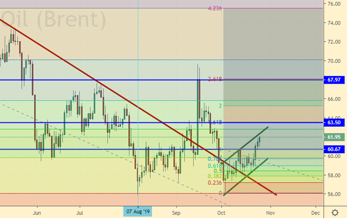 Сценарий роста: рассматриваем декабрьский фьючерс, дата экспирации 31 октября. Мы идем на 63.50. Более сильный рост без соответствующего фундаментального фона считаем невозможным.