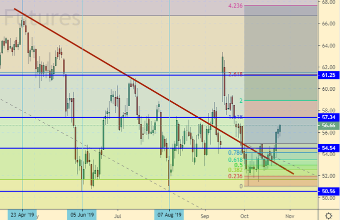 Сценарий роста: рассматриваем декабрьский фьючерс, дата экспирации 20 ноября. Прошли выше 55.00. Выше 59.00 вылететь не должны. Более реально выглядит максимум на 58.00, после чего может начаться очередная затяжная волна падения цен.