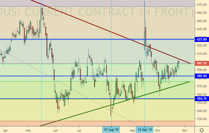 Сценарий роста: рассматриваем ноябрьский фьючерс, дата экспирации 12 ноября. Скромный рост. В случае прорыва выше 610.0 будем покупать. Учитывая, что потребление топлива в зимние месяцы падает, к покупкам относимся скептически.