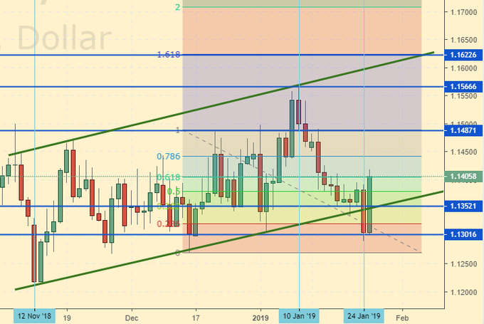 Сценарий роста: рынок капнул до 1.1300, но получив известие из США о том, что правительство возобновит работу на три недели (какая радость), мгновенно оторвал один цент от доллара. Правительственные игры за океаном воспринимались как фундаментальная слабость и ранее. Если американцы продолжат делать посмешище из своей страны на ровном месте, доллар ничего хорошего не ждет. Будем покупать евро.