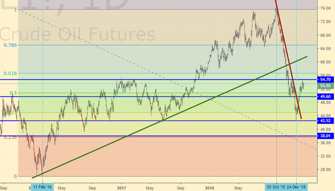 Как видим, рынок на фоне событий в Венесуэле не стал задирать котировки. То есть, пока делается ставка именно на рост добычи в стране после нормализации политической ситуации. Кроме того, мы будем видеть в статистических отчетах рост запасов нефти в США, так как заводы встают на профилактику. Таким образом, ждем умеренного снижения котировок.