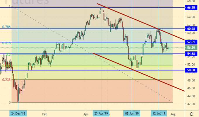 Сценарий роста: рассматриваем сентябрьский фьючерс, дата экспирации 20 августа. Мы не увидели даже роста к 59.00. Рынок остается во власти продавцов. Настроения далеки от бычьих. Возможно, увидим рывок к верхней границе падающего канала на следующей неделе, но проходить выше не должны.