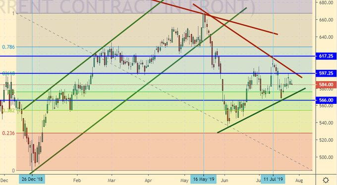 Сценарий роста: рассматриваем августовский фьючерс, дата экспирации 12 августа. Видим консолидацию. Для покупок попросим роста выше 610.0. Перспективы у рынка энергоносителей воспринимаются пока мрачно. Не покупаем.