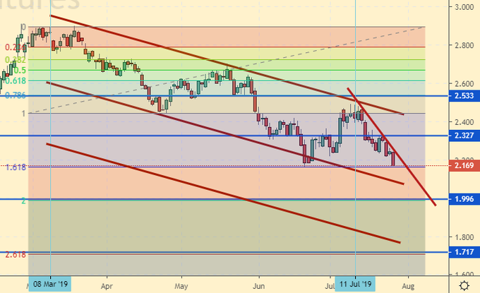 Сценарий роста: рассматриваем сентябрьский фьючерс с датой экспирации 29 августа. «Мы продолжаем оставаться внутри падающего канала и пока мы из него не выйдем вверх покупать смысла нет». Сложно что-то добавить к высказыванию недельной давности. Красная свеча пятницы не прошла 2.16, но это дело одного дня. Далее – 2.00.