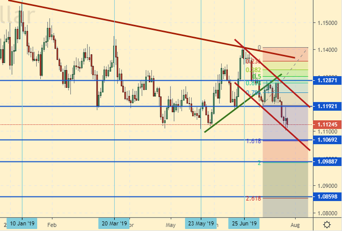 Сценарий падения: можно продолжать продавать при любых рывках вверх. От ФРС 31-го числа все ждут снижения ставки на 0,25% и это будет согласовываться с замедлением темпов роста ВВП до 2.1% во втором квартале. Но, как видим, на ожиданиях никакого ослабления доллара нет. Странно, если оно начнется по факту.