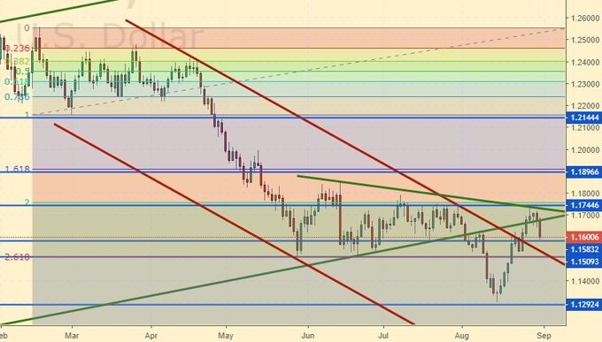 Сценарий роста: на прошлой неделе быки были невероятно злы. Но их сдержали, пусть и не на 1.1720, о чем мы писали, а несколько выше, но все же, все же. В связи с праздником в США в понедельник каких-либо сильных движений не будет. А там уж на горизонте выплывает очередная дата заседания ФРС – 26-е сентября. До неё еще далеко, но именно ожидания решения по ставке будут определяющими. Если размышлять о покупке евро на следующей неделе, то лучше сделать это от 1.1500.