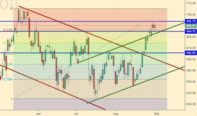 Сценарий роста: рассматриваем сентябрьский фьючерс, дата экспирации 12 сентября. Рынок закрылся выше 690.0. Если в понедельник мы снова закроемся выше данной отметки можно нарастить позиции. Медведи аннигилированы. Любые откаты используем для покупок. Судя по всему, нас ждут новые максимумы.