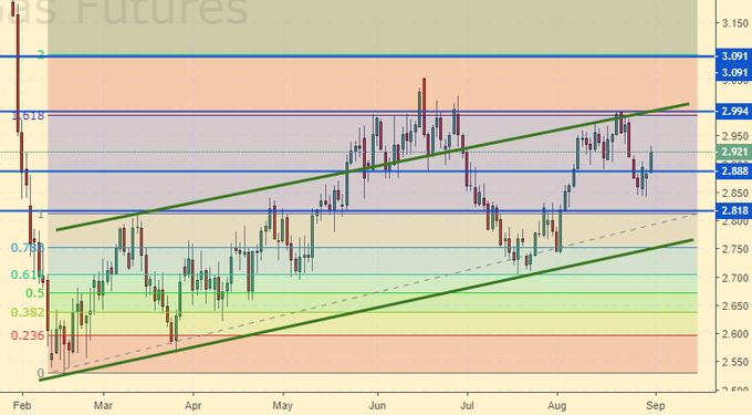 Сценарий роста: рассматриваем октябрьский фьючерс с датой экспирации 26 сентября. Удалось нам немного «обмануть судьбу» — закрылись на 2.88 и вновь открылись на 2.85. данная картинка четко бычья. Ждем роста цен. Для начала идем на 3.50.