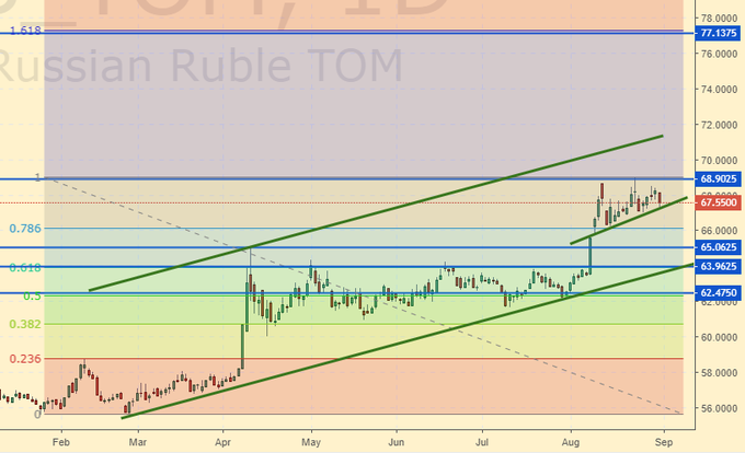 Вроде как санкции ввели против России, вроде как немного снизят пенсионный возраст для дам. Вроде продолжают покупать золото, но перестали временно покупать доллары. Нежелание кредитовать собственное производство и строительство, это кредитование оказывается в РФ убыточно, с точки зрения российских же банков, приведет к тому, что максимум, что мы увидим, это ход на 65.00, который возможен, с точки зрения техники, благодаря неплохо закрывшейся пятнице. Но нельзя исключать, что с понедельника будет новый штурм уровня 69.30, а про пятничное укрепление рубля просто забудут. Правительство продолжает молчать. План собрать десять триллионов денег и построить новый мост — это не план. Не надо стесняться, возвращайтесь к пятилетнему планированию во всех отраслях. Раз либерализм лишь порождает проблемы. Только биржу закрывать не надо. Биржа она показывает вам кто вы на данный момент есть.