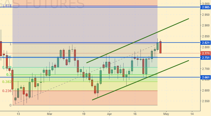 Сценарий роста: рассматриваем июньский фьючерс с датой экспирации 29 мая. Пятница позапрошлой недели была зеленая и мы выросли, пятница прошедшей недели красная. Упадем ли? Возможна коррекция до 2.70, чем можно воспользоваться для покупок.